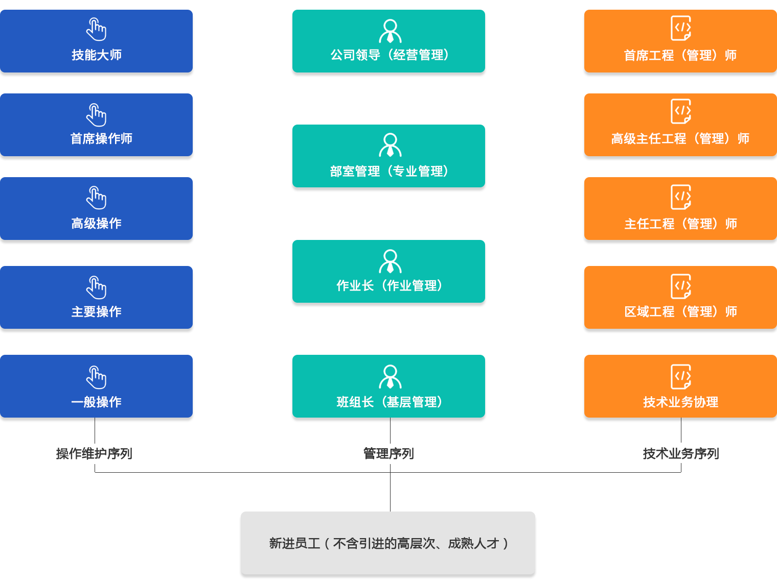 引導人才由“單一發(fā)展”向經營管理、專業(yè)技術和操作維護多方向“多重發(fā)展”,公司根據崗位需求情況,并結合員工實際能力、意愿,可在各序列間轉崗。